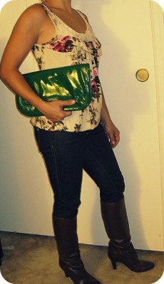 | Our veteran FFFF Challenger, Anh-Kay put together a GORGEOUS floral outfit this week! We love the green clutch (woot for the accessory!) and adore the vintage boots. Great work, AKP! |