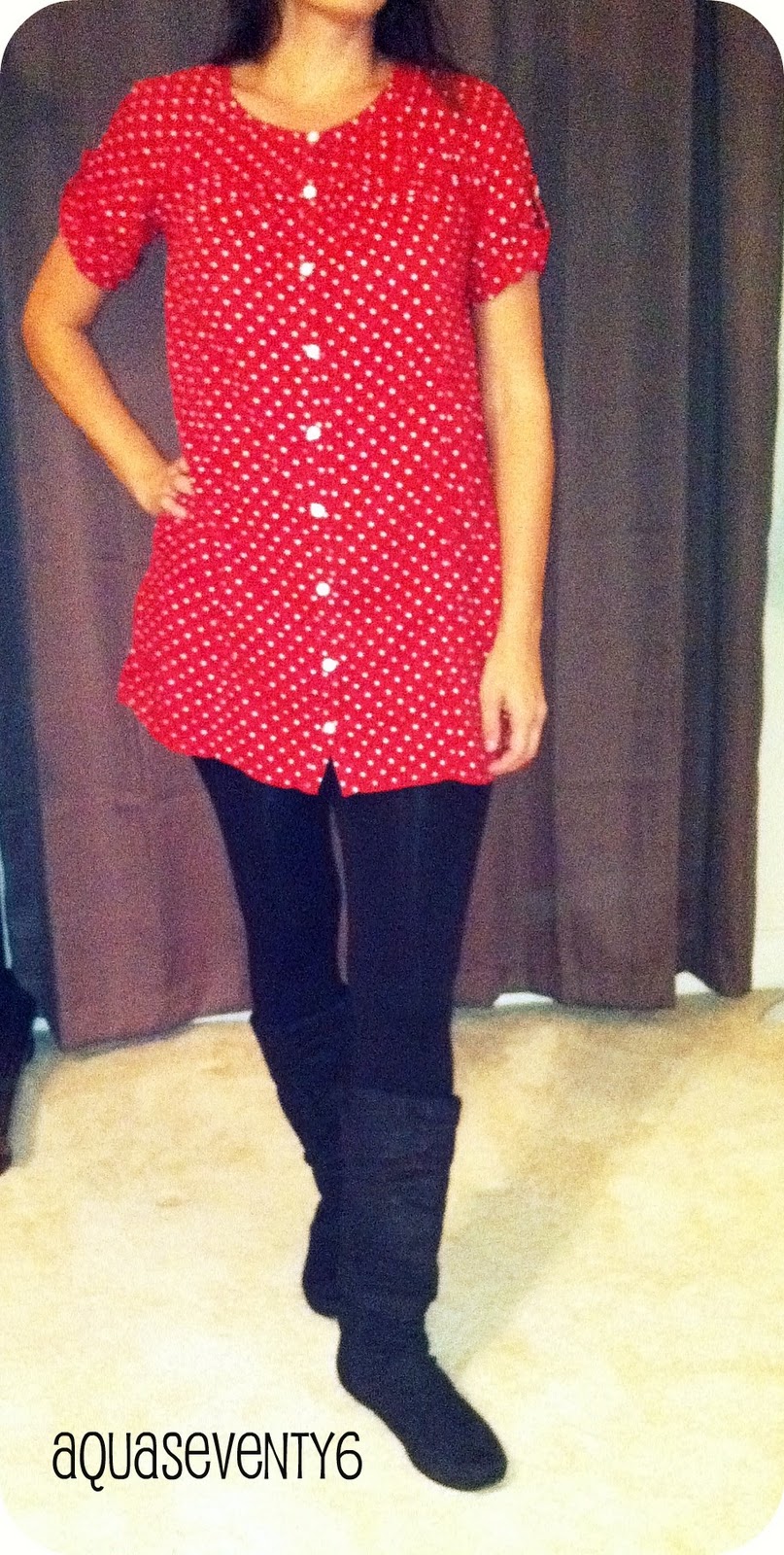 | This mini-dress/blouse is an H&M brand that I found at Goodwill a few weeks back for $4. The black leggings are from many seasons ago and my black Ross boots. |