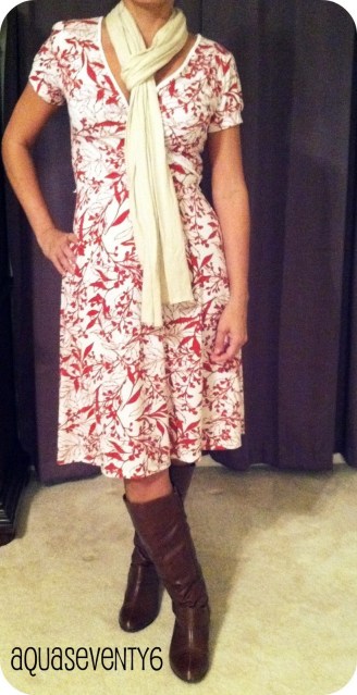 | I bought this dress years ago at Ross, paired it with my favorite soft scarf and boots for a floral red look. |
