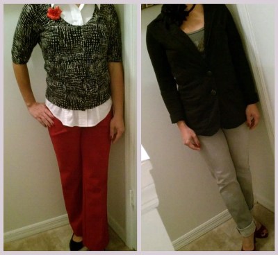 | Loyal participant, and fashionista, AnhKay from Glass Slippers on a Budget, put together two great red-inspired looks this week! She used the bonus accessory as inspiration for her red flower pin and her black flower choker. Love the red peep-toe pumps! |