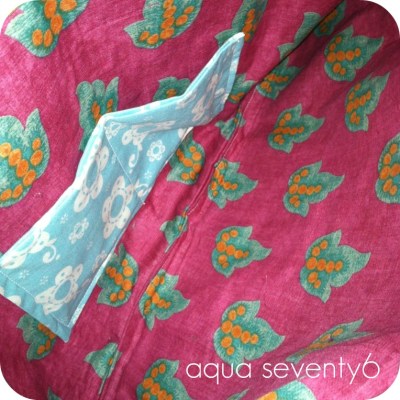The first thing I did was remove all of the stitching. This left me with one large quilted piece (beige), and two smaller pieces of a thin cotton (pink). I then cut the quilted piece in half (through the short side) and used that for the exterior and one of the small pink pieces as the lining. The other piece of pink fabric I cut into strips and sewed together to make the strap.