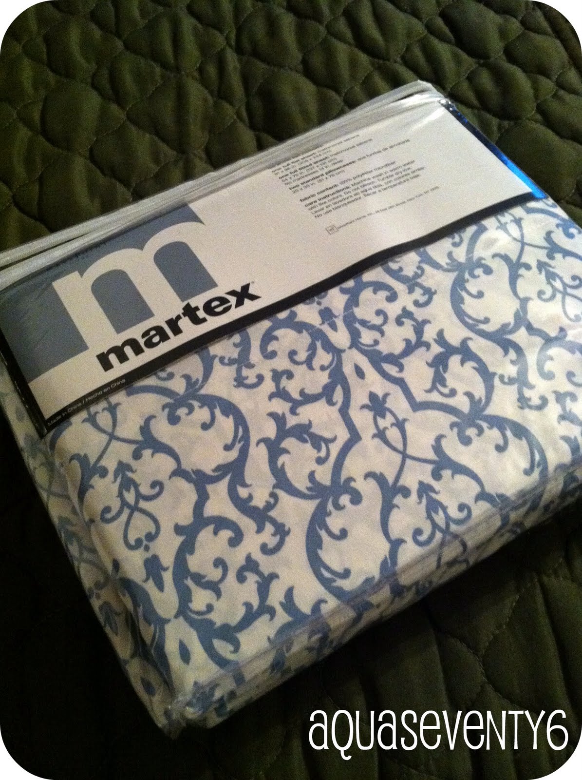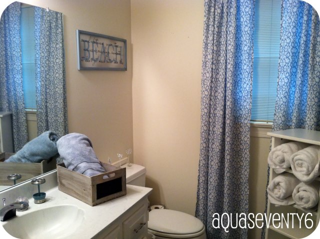 I was lucky enough to find matching towels and a bath rug, but what the bathroom really needed were curtains.  I scoured the fabric stores, but nothing stood out.  It wasn’t until one afternoon perusing Ross that I found a sheet set with the perfect pattern and color to match the bathroom.